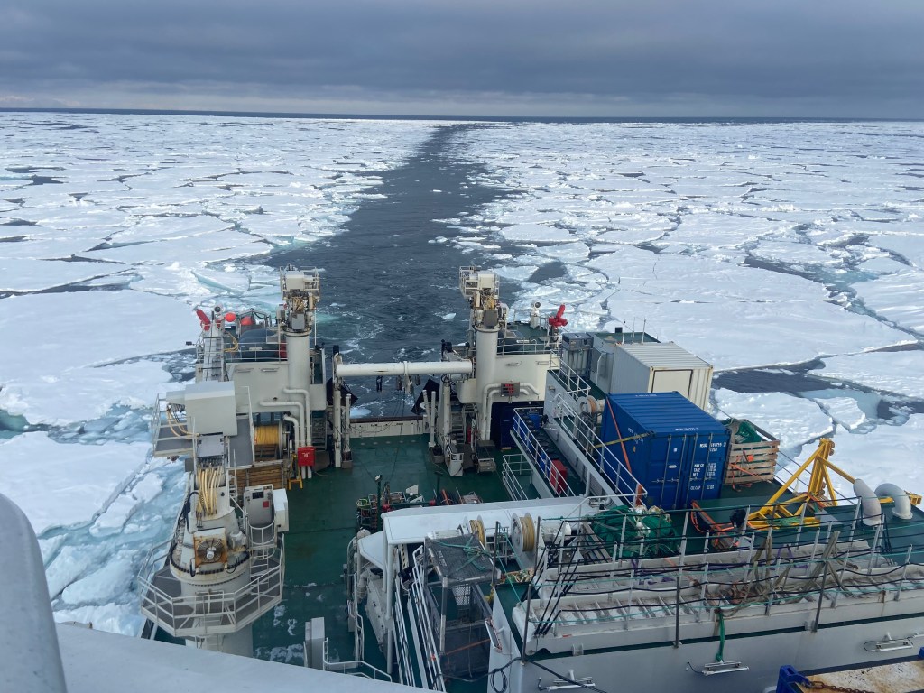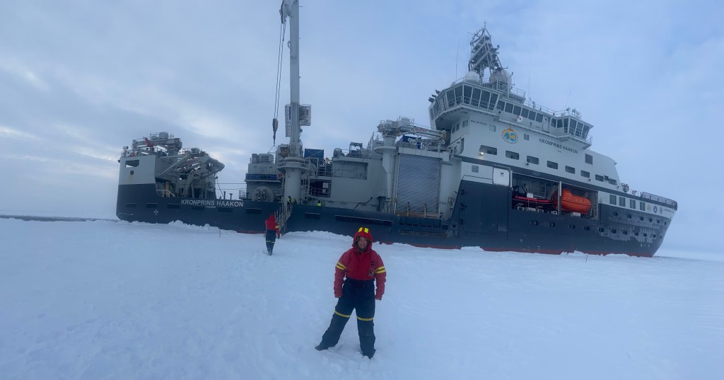 One of our first stations was actually not for seafloor samples at all – but for samples of sea ice. And this meant showing off the icebreaking capabilities of the RV Kronprins Haakon by moving in to the sea ice until we found a spot with thick enough ice to walk on. And after the ice-team had taken their samples, those who wanted got to take a quick walk on the ice just for the experience.