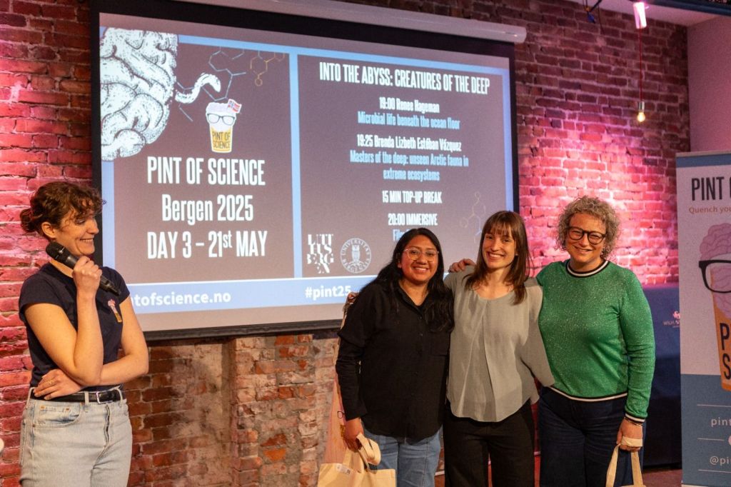 The CBE Arctic team has had a busy spring with many outreach events. In May, the Pint of Science Bergen team and Centre for Deep Sea Research, UiB hosted a special evening at Litteraturhuset i Bergen titled “Into the abyss: creatures of the deep sea”, as part of the Pint of Science 2025, a science festival taking place in more than 500 cities worldwide. Brenda from the CBE Arctic Team gave a presentation titled “Masters of the deep: unseen Arctic Fauna in extreme ecosystems”. She introduced chemosynthesis-based ecosystems, explaining what they are, why they are so unique, and how we sample them, in an entertaining and accessible way. She had a lot of fun showcasing the remarkable fauna from Arctic CBEs, such as rissoid snails which became the stars of the evening despite their small size!